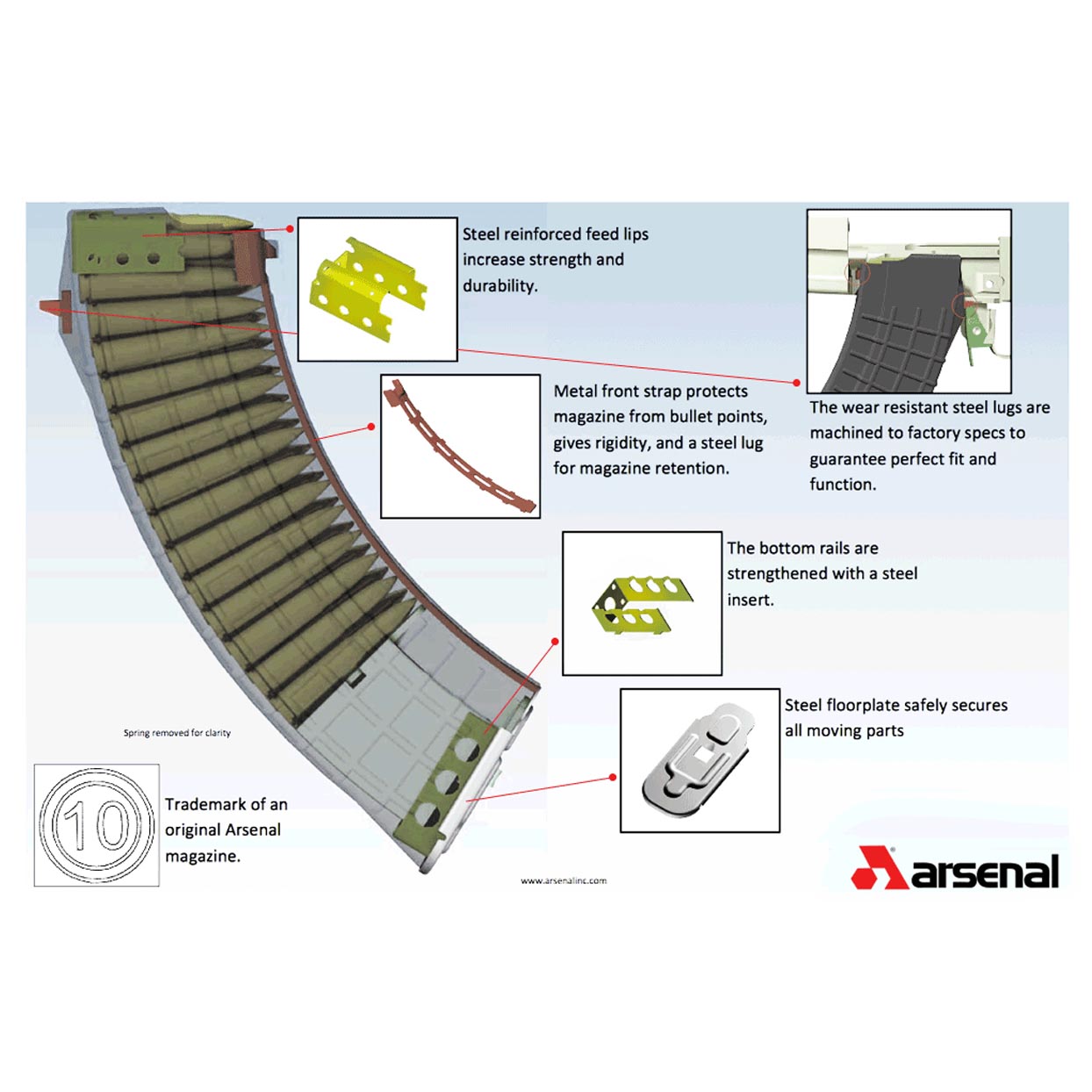 Arsenal Circle 10 magazines are inarguably the finest AK magazines in the world-period. They are the ONLY magazine to pass 100% of the military drop tests, 100% of the time. Circle 10 magazines are made from the highest quality polymer, contain steel reinforcements front/back, steel feed lips, and a steel locking lug. Should you drop your loaded rifle or run into something, they WILL NOT break off and leave you with a possibly non-functioning gun.